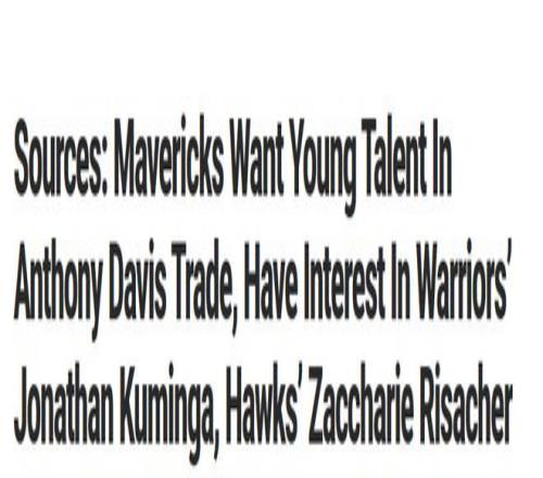 北京时间1月4日,据独行侠队记阿夫塞斯从NBA消息人士处获悉,独行侠在关于安东尼-戴维斯的交易中,优先考虑引进至少一名有影响力的年轻球星,并且对勇士队前锋库明加以及老鹰队侧翼里萨谢感兴趣。而勇士队和老鹰队均有意通过交易得到戴维斯。