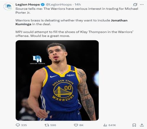 早些时候美媒LH透露,有消息人士告诉我,勇士对小波特很感兴趣,勇士管理层正在讨论是否将库明加纳入方案,勇士队希望MPJ在体系中扮演克莱的角色,这将是一个明智的选择。