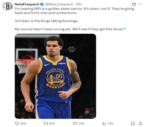 篮网媒体NetsFrequent则透露:我听说小波特已经是勇士成员之一,交易不是问题时间才是,他们正在就选秀权进行讨论。交易的第三方是国王队他们会得到库明加,我的消息源从未出过问题,我们一起见证这笔交易的达成吧。