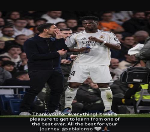 在哈维-阿隆索离任后,皇马中场楚阿梅尼在社交媒体发布了一张他和阿隆索的同框照,并写道:“感谢你所做的一切!能向史上最佳之一学习是一种荣幸。祝你未来的旅程一切顺利 ”