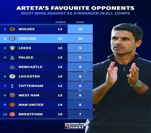 根据德国足球转会市场的最新统计,阿森纳主帅阿尔特塔在执教生涯中,面对切尔西取得了16场10胜的战绩,这是他赢球次数最多的对手,与狼队并列胜场榜首位。