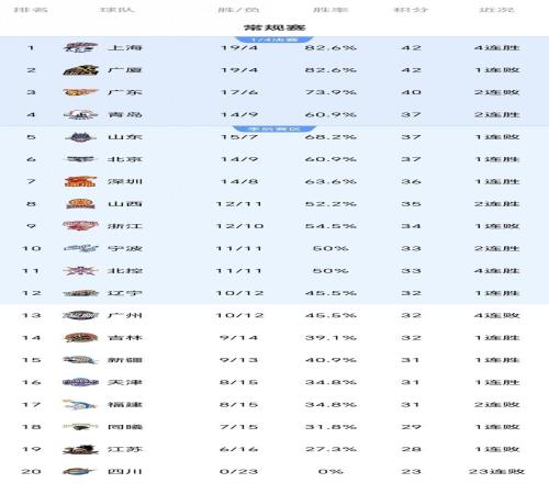 本轮比赛结束后,联赛积分榜出现了新的格局,上海队凭借本场胜利,战绩提升,在排名上实现了反超,广东队则因连败,排名有所下滑,中游集团的竞争依旧激烈,青岛、浙江等队的胜负差非常接近,榜尾区域,多支球队胜场数接近,保级形势错综复杂。